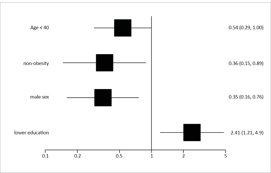 For Toxo-Ig, an independent variable, the stepwise multivariate binary logistic regression model was built using the significant results from the univariate analysis (Table 2). After eliminating statistically insignificant results, finally 4 variables were included in the multivariate model (Somers՚ D = 0.69; Kolmogorov–Smirnov statistic = 0.55; p = 0.0001). The analysis revealed that the factors reducing the likelihood of ToxoIgG (+) were: < 40 years of age (OR 0.54, 95% CI 0.29-1.00; p = 0.04), no obesity (OR 0.36, 95% CI 0.15-0.89; p = 0.03) and male gender (OR 0.35, 95%CI 0.16-0.76; p = 0.008). The only factor significantly associated with an increased likelihood of Toxo-IgG (+) was lower education (primary or vocational school) OR 2.41, 95% CI 1.21-4.79; p = 0.01 (Figure 1).