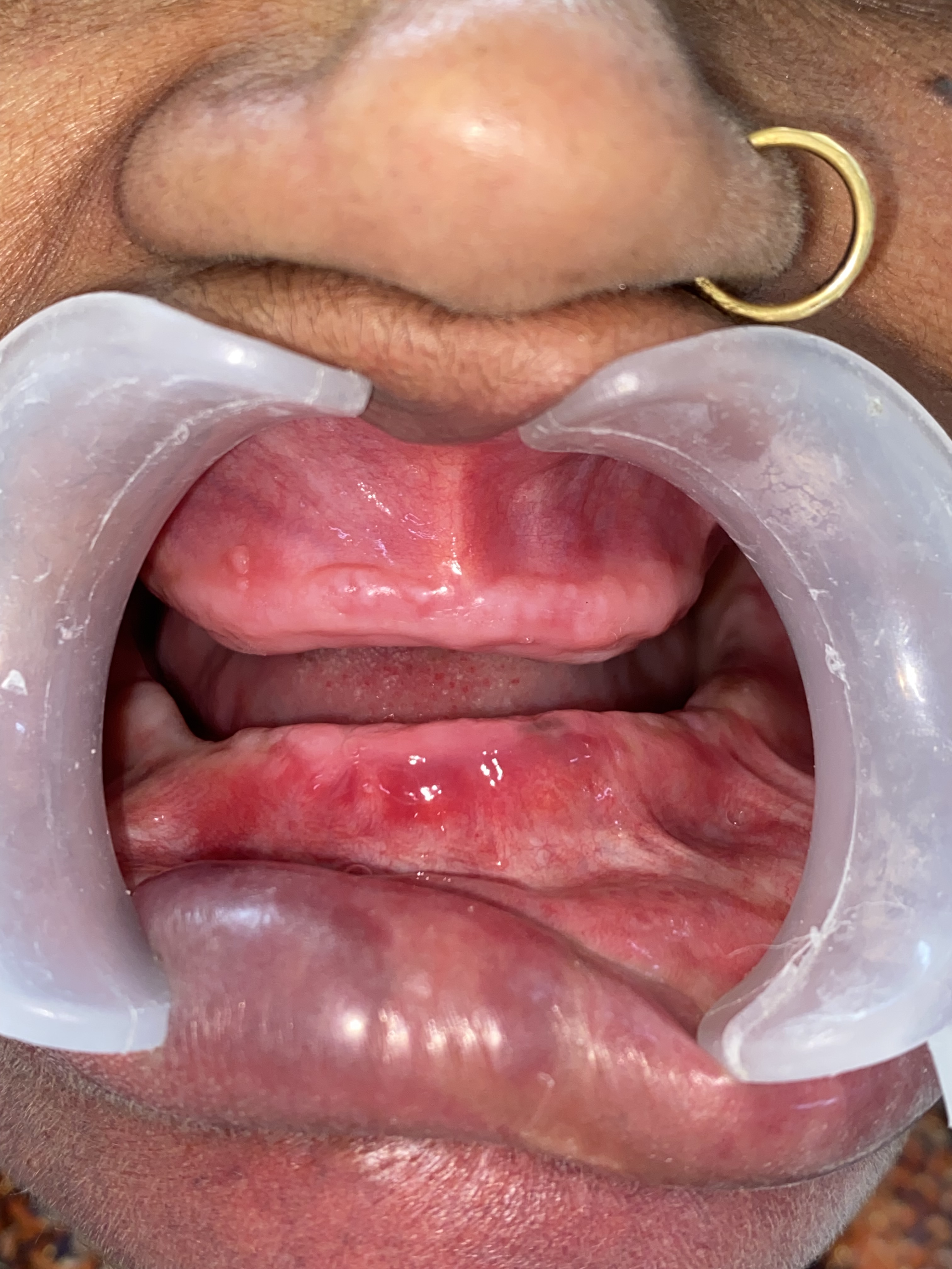 On intra-oral examination, diffused blanched white bands were seen bilaterally on the buccal mucosa in the molar region (Figure 3). The bands were taut and tough which led to a limited mouth opening. The hemangioma extended up to the buccal mucosa adjacent to the pre-molar region. There were completely edentulous maxillary and mandibular alveolar arches which had red discoloration on the mandibular anterior region due to the hemangioma present intraorally as well (Figure 4). Based on the physical examination and medical history, the patient was diagnosed with grade II OSMF.