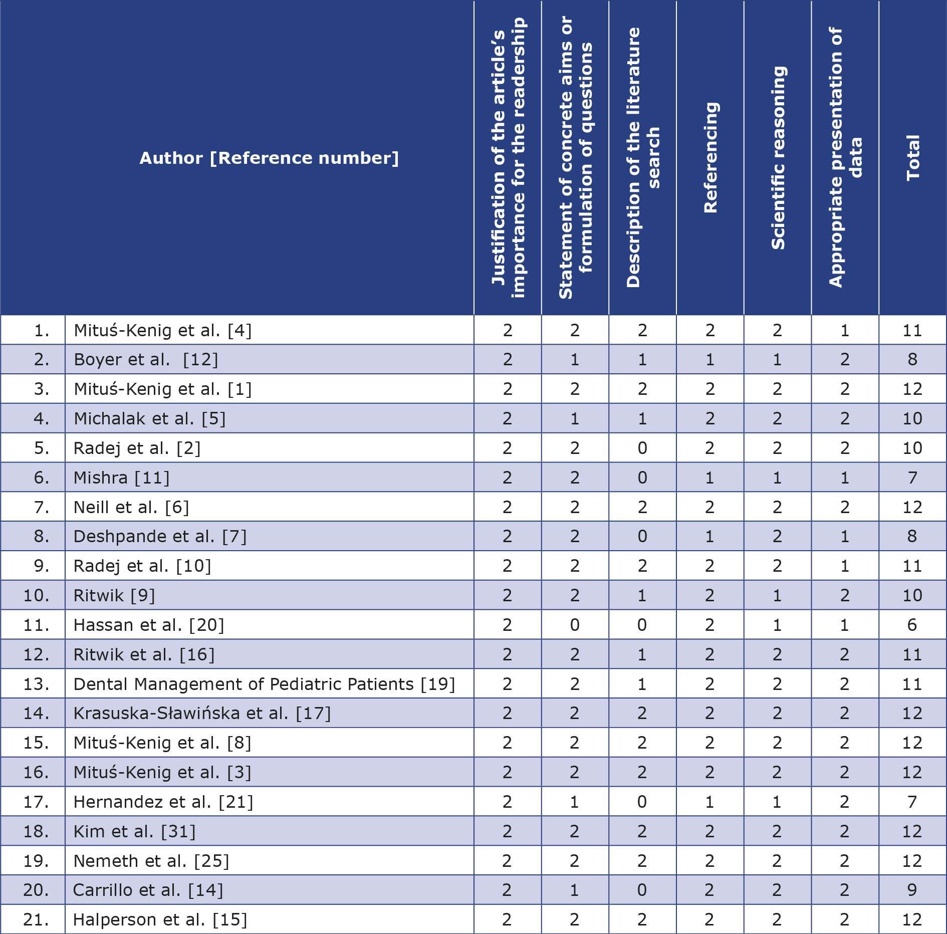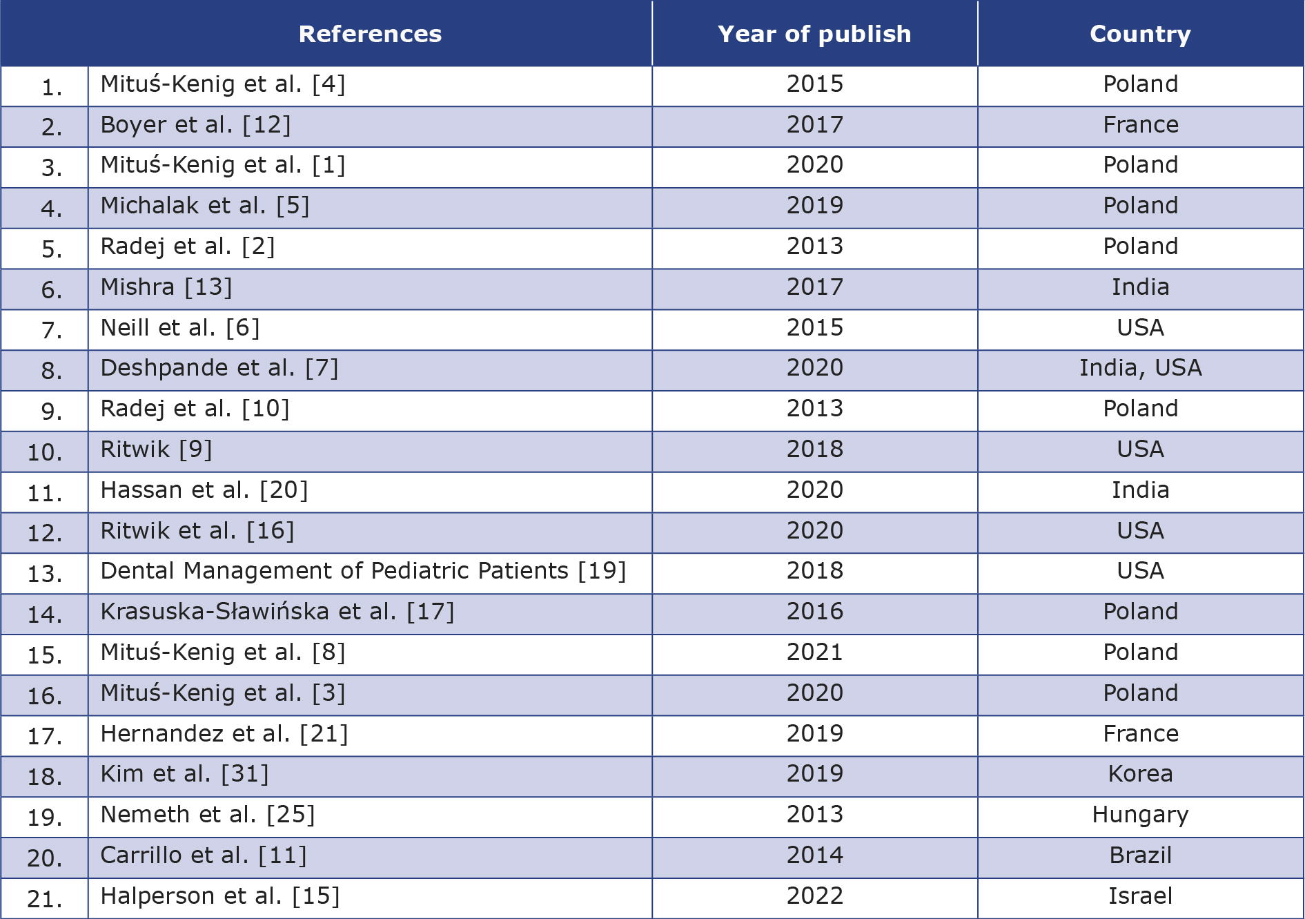 Electronic databases PubMed, Scopus and Google Scholar were searched using the keywords “cancer”, “carcinoma”, “orthodontic treatment”, yielding 17 (Scopus), 182 (PubMed) and 15900 (Google Scholar) results (see Figure 1). The search results were limited to English and Polish language only, which resulted in 15 (Scopus), 179 (PubMed) and 11700 (Google Scholar) items. The results were further narrowed down to publication years 2010-2022, which reduced the number of records to 13 (Scopus), 162 (PubMed) and 11400 (Google Scholar). Articles on adult patients, epidemiology and duplicates were excluded, and a total of 26 articles were selected. Their content was analysed and finally 21 articles that matched the topic and contained valuable information were included in the review (see Table 1).