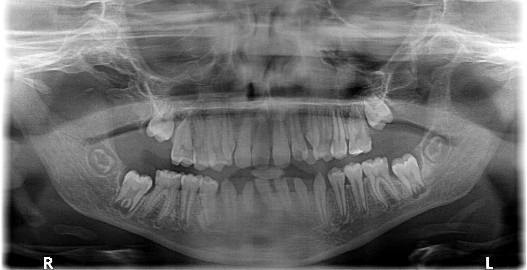 Figure 1. Panoramic radiograph of a 9-year-old girl treated for acute lymphoblastic leukaemia from the age of 15 months with subsequent 2 years of radiotherapy, chemotherapy, immunotherapy and antibiotic therapy, along with allogenic hematopoietic stem cell transplantation and two administrations of mesenchymal stem cells. Visible root shortening of all permanent first molar teeth, V-shaped roots of teeth 16 and 26, narrow roots of teeth 22, 36 and 46, absence of tooth buds 15, 25, 35 and 37, residual bud of tooth 47, microdontic buds of teeth 17, 14, 24, 27, 34 and 44 with disturbed mineralization (irregular crown outlines).