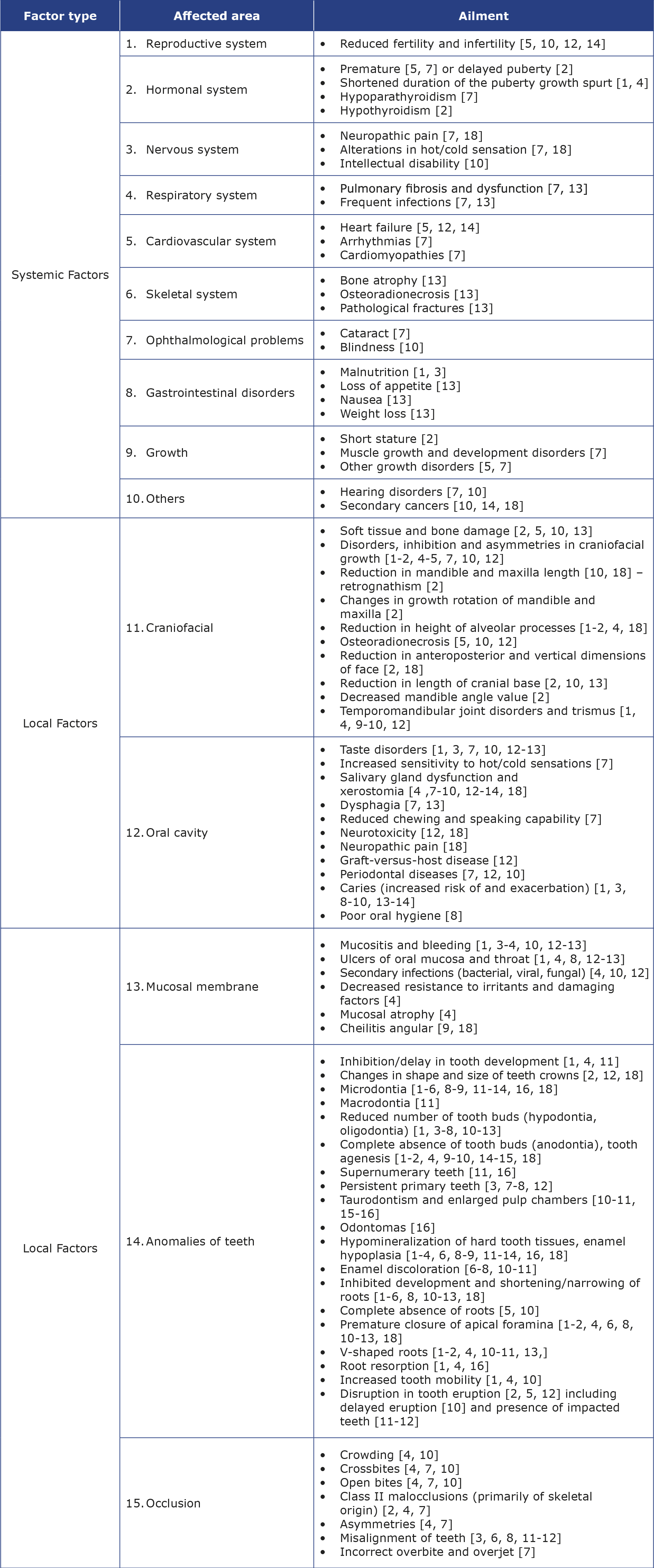 The adverse effects of oncological therapies conducted in childhood are caused by the cancer itself, the applied treatment (including immunosuppressive therapy), the supportive care or their combinations [5-6]. The severity and extent of adverse effects depend on the patient’s age (and thus their stage of development), psychological state, tumour-related factors (location, stage and extent at the time of detection), treatment (type, intensity and duration), as well as genetically conditioned sensitivity [4, 10, 14]. Systemic complications can be immediate or distant and influence the overall growth and development of children, including their hormonal, cardiovascular, respiratory, nervous, skeletal and reproductive systems [4, 15]. The development of the cranium, cervical vertebrae and the entire oral cavity (including teeth and jaws) is also altered [6, 9].