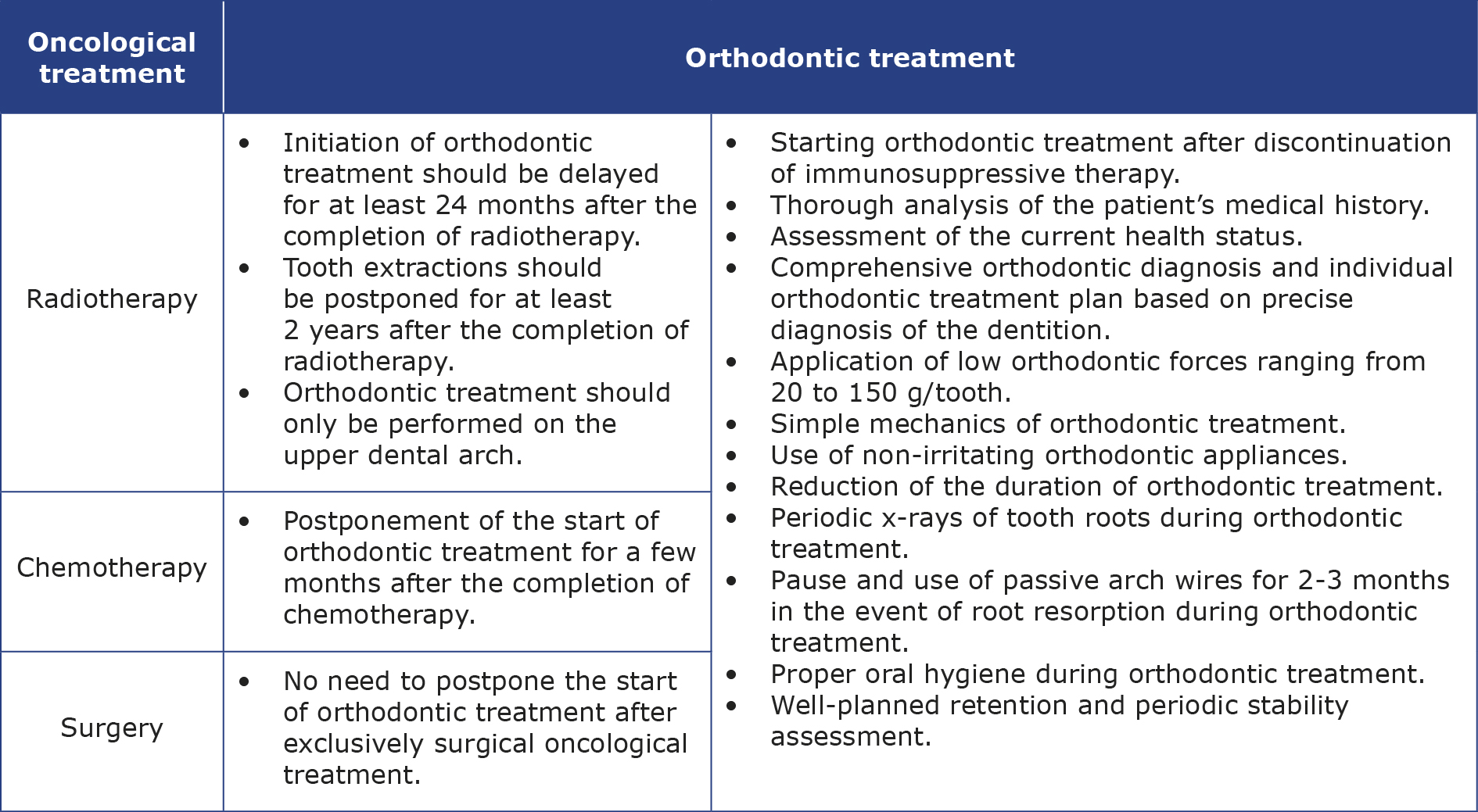 Orthodontic treatment must be not only deferred until the completion of the full cycle of anti-cancer therapy, but it is also recommended to postpone it by at least 24 months after the end of oncological treatment if no symptoms of cancer are present during this time [1-2, 4-5, 10-11]. This is related to bone metabolism disturbances caused by oncological treatment and the risk of cancer recurrence, which is reported in 2.6% - 12.1% of patients [4, 12]. An additional condition is the cessation of immunosuppressive treatment [1-2]. A shorter deferment period lasting a few months post-oncological therapy may be considered in patients treated with chemotherapy only [12]. In cases of exclusively surgical treatment, immediate commencement of orthodontic treatment is permissible without a 24-month latency period, provided the tumour has been completely excised and the lymph nodes are normal [2, 5, 10].