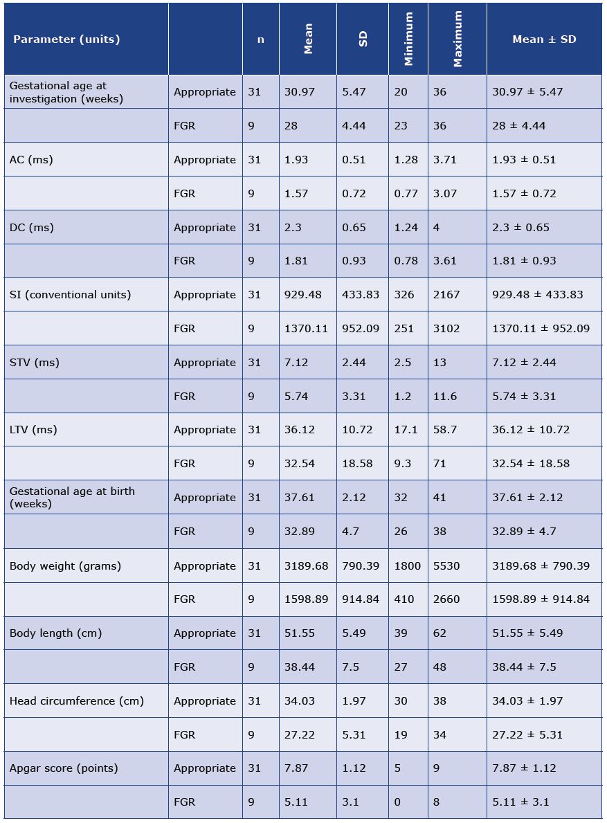 Results: FGR was detected in 9 women. The fetal growth was appropriate in 31 patients. 8 patients were excluded from the study. The detected variables of HRV in FGR were different, however statistical significance was impossible to determine (small number of cases). A strong linear correlation was detected between all the HRV variables: AC, DC, SI, STV, and LTV. Whereas, AC and DC had significant correlation with the 1-minute Apgar score. Multivariate regression analysis showed a statistically significant correlation of SI with the gestational age at birth.