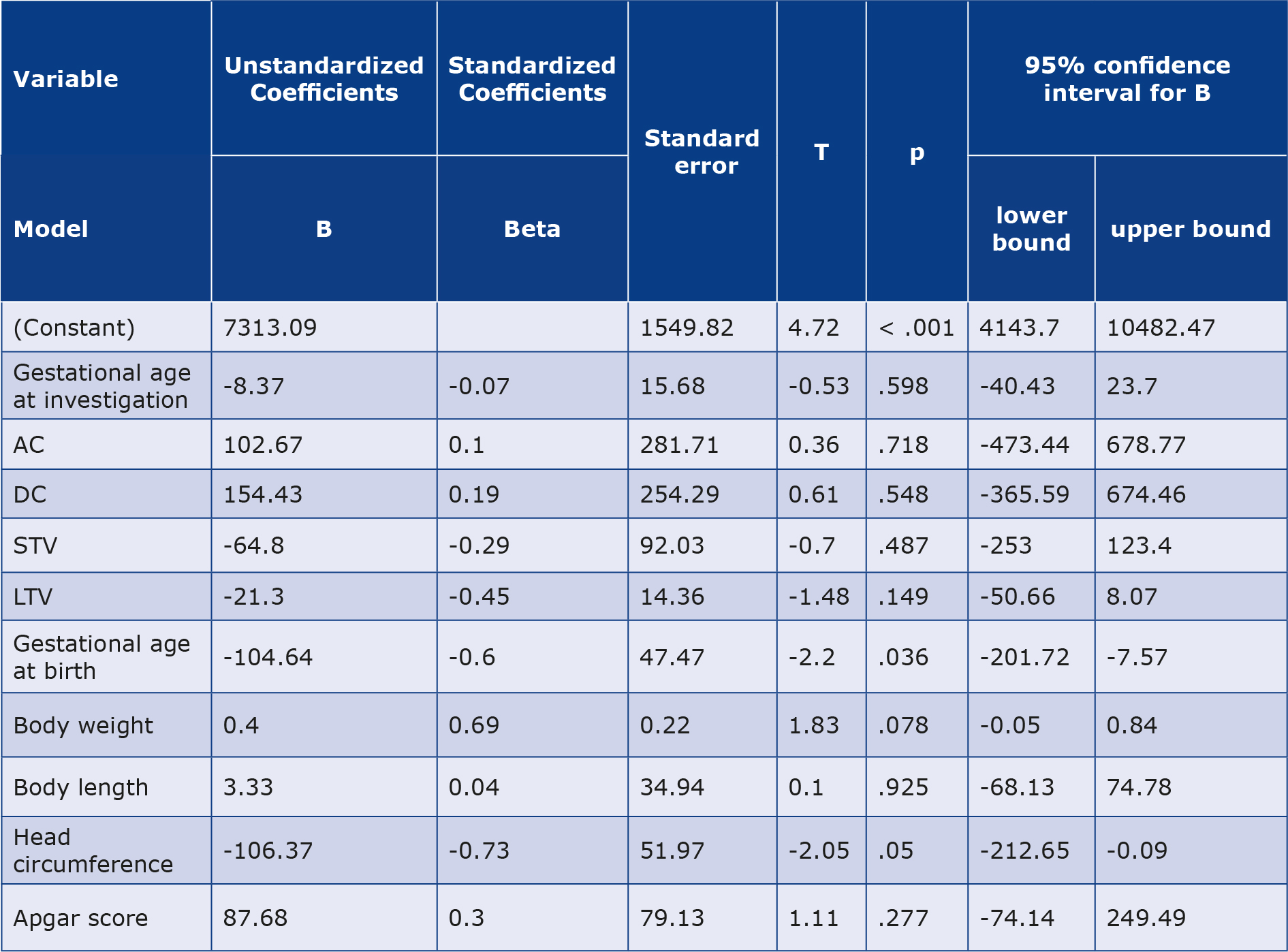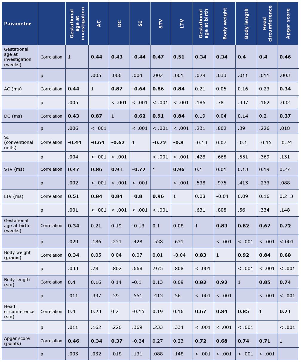 Table 2 shows a significant or moderate correlation between the gestational age at investigation and all other parameters: AC (r = 0.44; p = 0.005), DC (r = 0.43; p = 0.006), SI (r = -0.44; p = 0.004), STV (r = 0.47; p = 0.002), LTV (r = 0.51; p = 0.001), gestational age at birth (r = 0.34; p = 0.029), body weight (r = 0.34; p = 0.033), body length (r = 0.4; p = 0.011); head circumference (r = 0.4; p = 0.011), and the Apgar score (r = 0.46; p = 0.03). A strong or moderate correlation was detected between all the HRV variables: AC, DC, SI, STV, and LTV. AC and DC both demonstrated a significant correlation with the 1-minute Apgar score. However, no correlation was found between HRV variables and neonatal biometry at birth.
