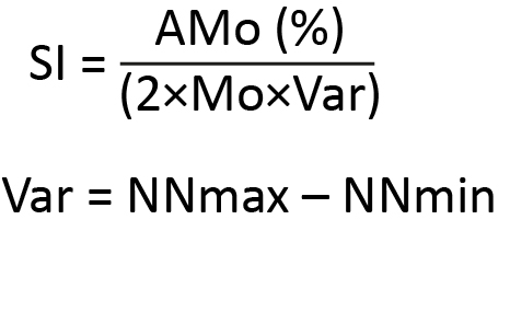 All of the fetal HRV variables were obtained from an RR-interval time series recorded from the maternal abdominal wall via the Cardiolab Baby Card NI-FECG device (XAI Medica, Kharkiv, Ukraine). The recordings lasted 30-60 minutes. The SI was selected for evaluation among all linear HRV variables and calculated according to the formula below.